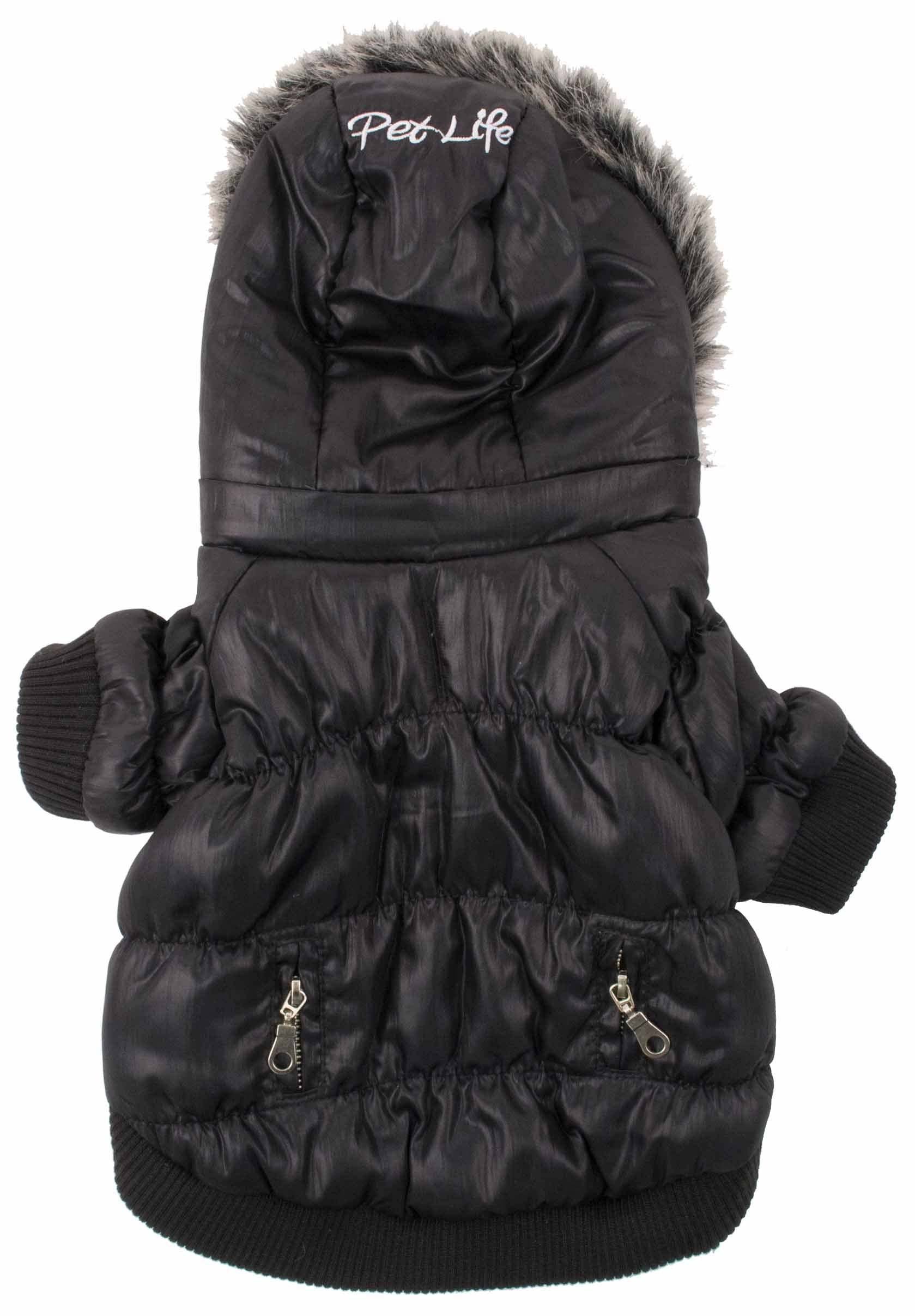 The Pet Life Metallic Parka Dog Coat contains Thinsulate thermal heat retention technology as an inner shell specially inserted between the fabric. This pet coat features matching tone-on-tone inner fleece fabrics, a faux fur removable zip-off hood, a leash slit, and belly-velcro closures for easier on and off access. This coat will keep your pet warmer during those harsher cold weather condition. Available in multiple sizes and colors.